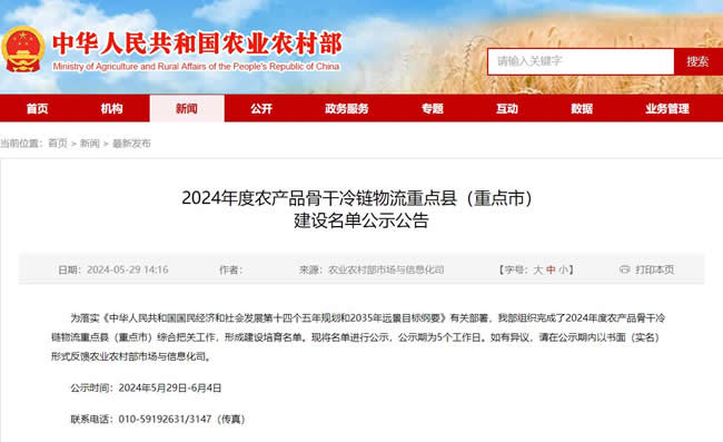 2024年度農(nóng)產(chǎn)品骨干冷鏈物流重點縣(重點市)建設(shè)名單公示公告